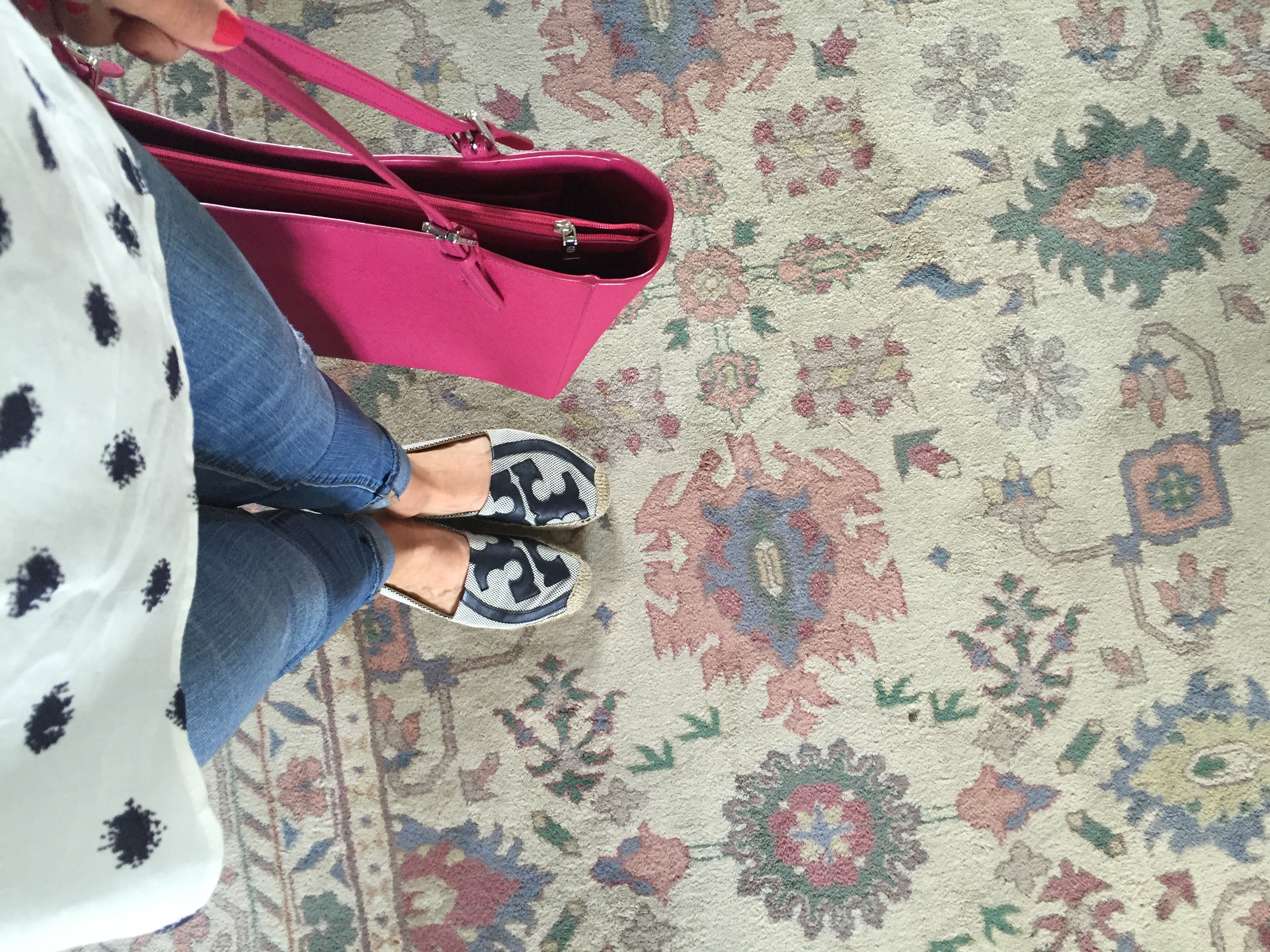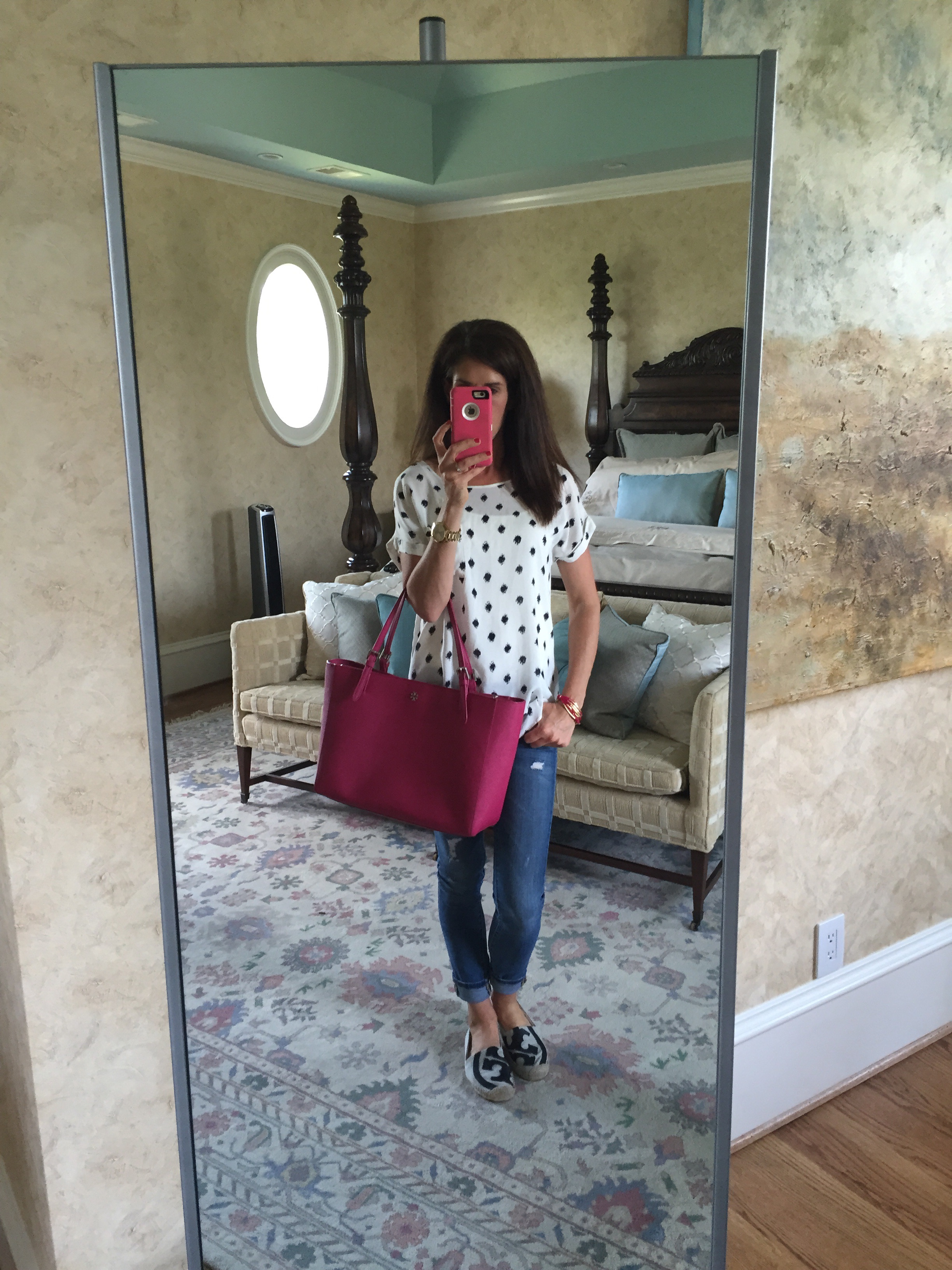 Bag: Tory Burch (the exact color -carnation red- isn’t available online any longer but you can call Tory Burch and they can locate it in a boutique for you and it will be shipped for free. ( similar )
