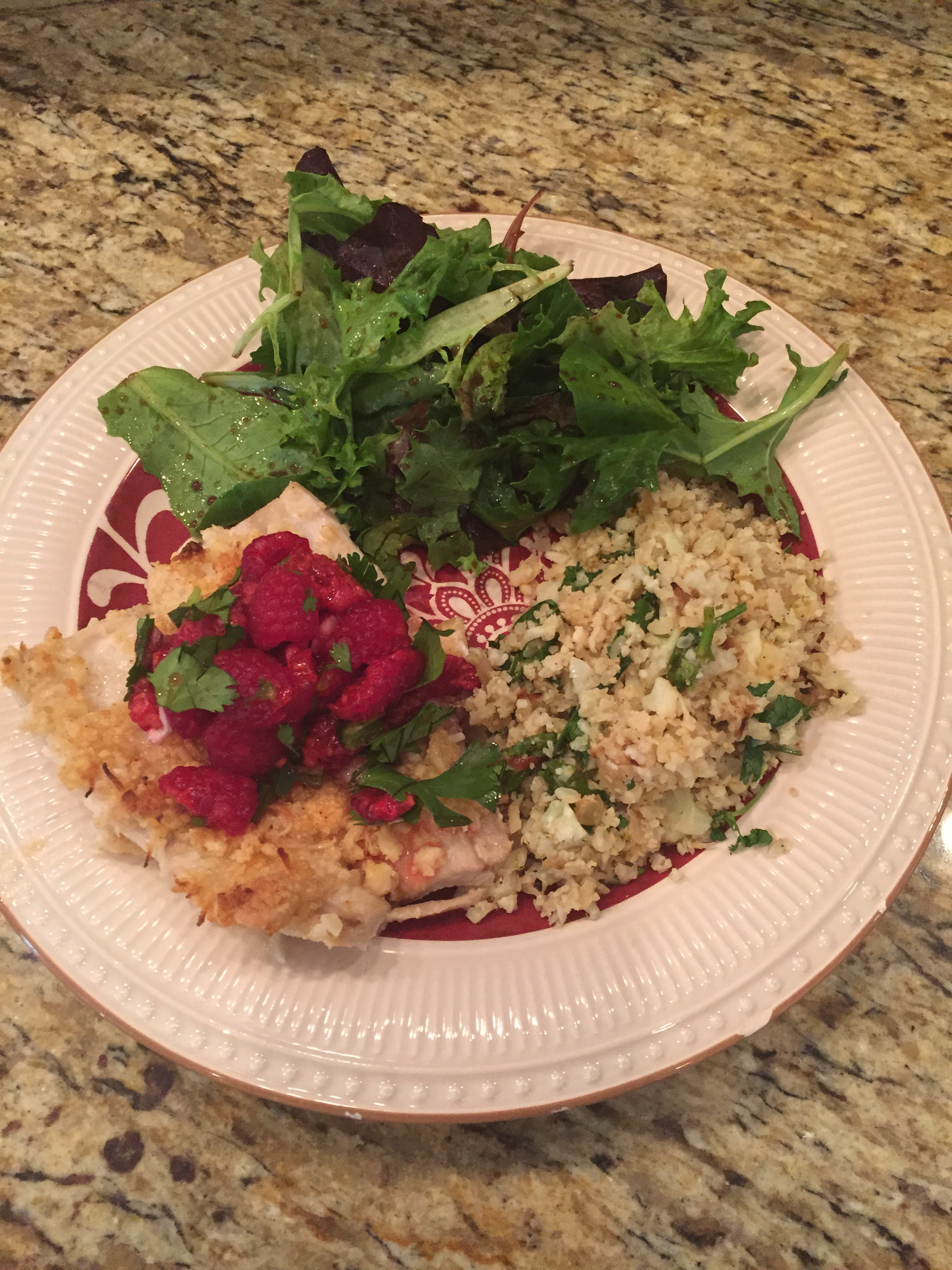 This is probably my favorite fish dish of all time. I went to Hawaii on my honeymoon 11 years ago and everything there seemed to be coated in macadamia nuts! I’m exaggerating, but there were a ton a macadamia nut dishes I had while we were there. I tried to recreate a local dish for dinner tonight. I should have taken more pictures while I was prepping. Sorry. This meal looks fancy and is definitely a company worthy dish but it’s very simple to make. I served the fish with a mixed green salad and cilantro lime cauliflower rice. I have “riced” cauliflower in the food processor and using a big grater. I think the grater is easier and faster. I have to chop up the clauiflower and put it into my food processor in multiple matches. When I use my grater I cut off the leaves and just grate the whole head of cauliflower, starting on one side down to the stem/core and then flipping it over and doing the same on the opposite side. The recipe below is for 2 people.I usually double it to feed me, my husband and our kids. I hope you enjoy this Hawaiian inspired meal as much as I do!