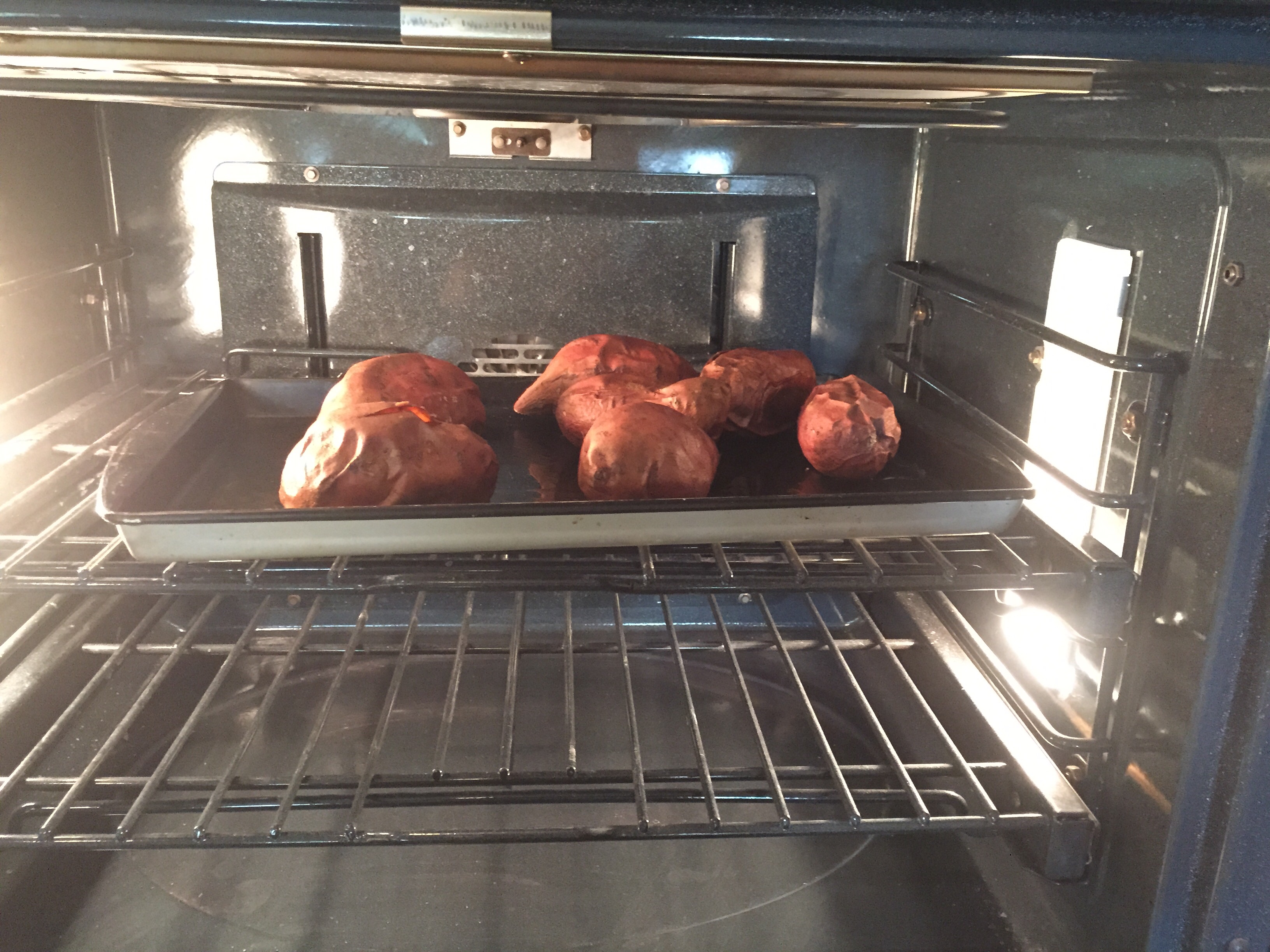 - bake 8-10 sweet potatoes. (I eat a ton of sweet potatoes. I eat 1/2 to 1 after workouts, along with a lean protein like chicken. I also eat one for breakfast before a long workout. ) Place sweet potatoes on a cooking tray and coat with coconut oil. This helps for easy removal of skins when you are ready to eat and adds flavor to the sweet potatoes. Pierce each potato with a fork and bake at 400 degrees for 50 min, or until potatoes are done. Store them in the refrigerator once they have cooled. They will keep for a week in your fridge and can be reheated in your microwave.